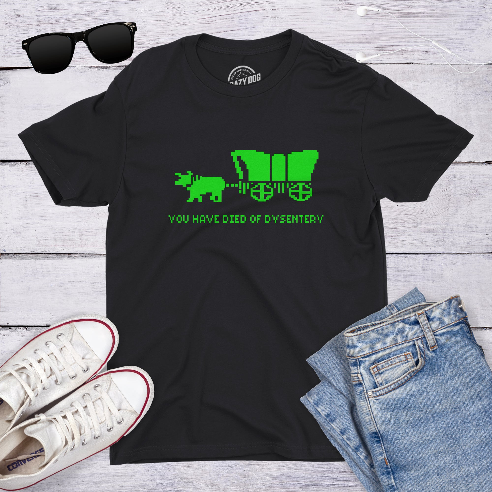 Oregon trail died of dysentery t shirt. Screened on a high quality tee. You will love this funny t shirt from the 80s video game!